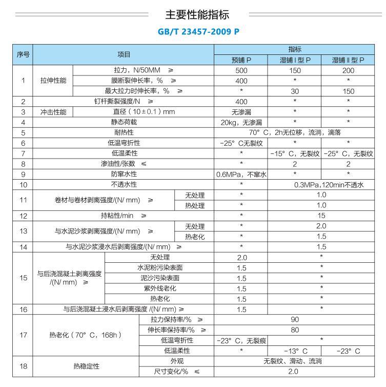 产品以高分子均质片材为主体材料,表面涂盖自粘材料,适用于后浇筑混凝土或水泥浆拌合物粘结的防水卷材。卷材自粘层具有自愈功能,与液态混凝土浆料反应固结后,形成防水层与混凝土结构的无间隙结合,杜绝层间窜水隐患,能有效提高防水系统的可靠性。该产品既解决了高分子防水卷材在施工中诸多难点、弊病、同时又解决了改性自粘橡胶沥青防水卷材的一些性能弱点,从而实现了叠加防水功能防水功效,达到国内领先水平。