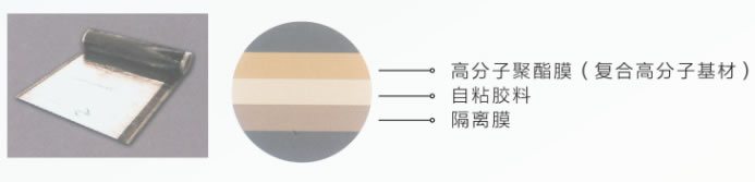 该材料集高分子材料与自粘卷材优点与一身,其抗拉强度和耐老化性优良,大大提高防水效果。其表面聚酯膜美观,在气温较高的情况下施工,很好的解决了其它自粘卷材易起鼓的现象。卷材施工完毕还可直接在其上绑扎钢筋或浇筑混凝土,地下室侧墙外防水施工后可直接回填土,不会构成对防水层的破坏。