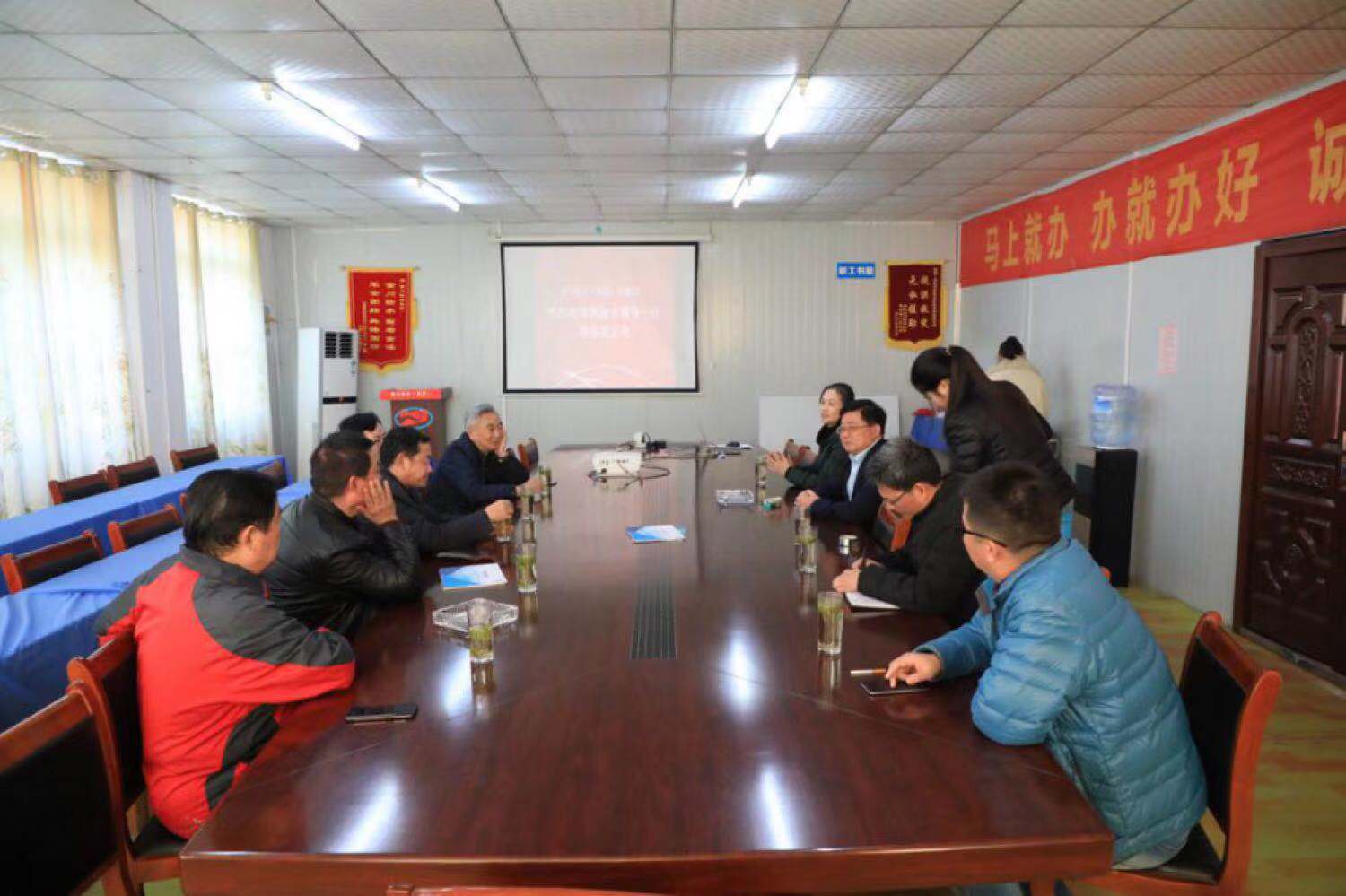 考察结束前,考察团一行来到我司大会议室,对公司项目的工程进度、工程质量控制、工期计划等方面进行了详细的了解,并与公司董事长许小金交换了意见。并希望金川防水(集团)不断提升企业综合实力,提高在行业中的地位,为促进地区经济发展和防水事业做出更大的贡献。
