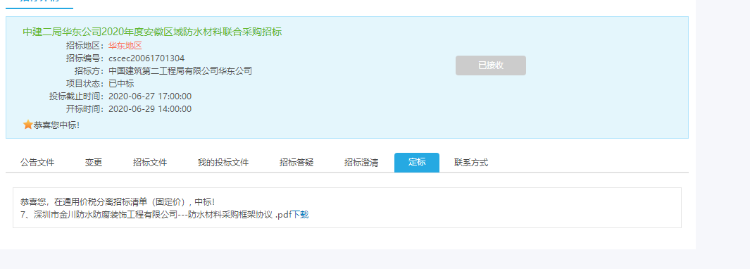 喜报——我司中标中国建筑第二工程局有限公司华东公司2020年度安徽区域防水材料联合采购项目