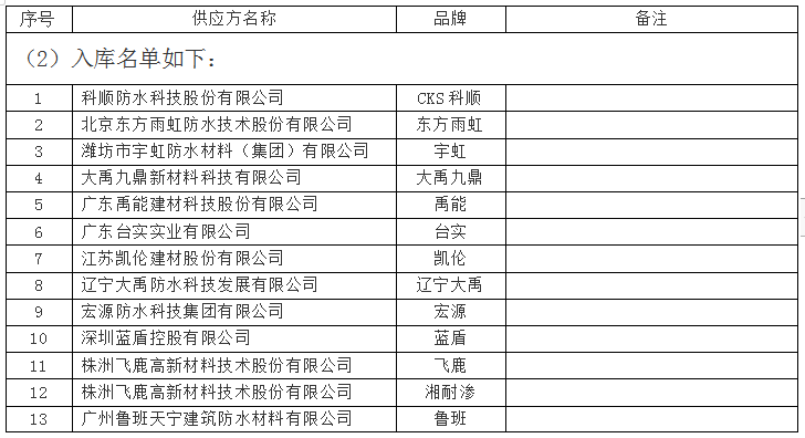 2021年8月25日,广州市重点公共建设项目管理中心为保障广州市重点公共建设项目管理中心工程项目主要材料、设备的规范使用,进一步加强材料设备品牌及供应方管理,规范材料设备品牌及供应方的选用程序,保证工程建设质量,有效控制工程投资,面向社会公开征集材料设备品牌及供应方。经企业自主报名,首批拟入库的43家建筑防水材料类企业名单予以公示。