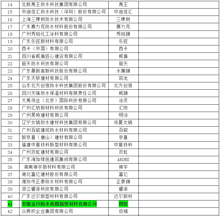 金川防水(集团)旗下的安徽金川防水防腐新型材料有限公司“固若品牌”,从资料申报到专家评审组严格审查、层层筛选,经过综合评审,此次能成为广州市重点公共建设项目管理中心的入库品牌及供应商,不仅是对我公司产品的肯定,更是对金川防水(集团)综合实力的一次集中检阅和极大认可。