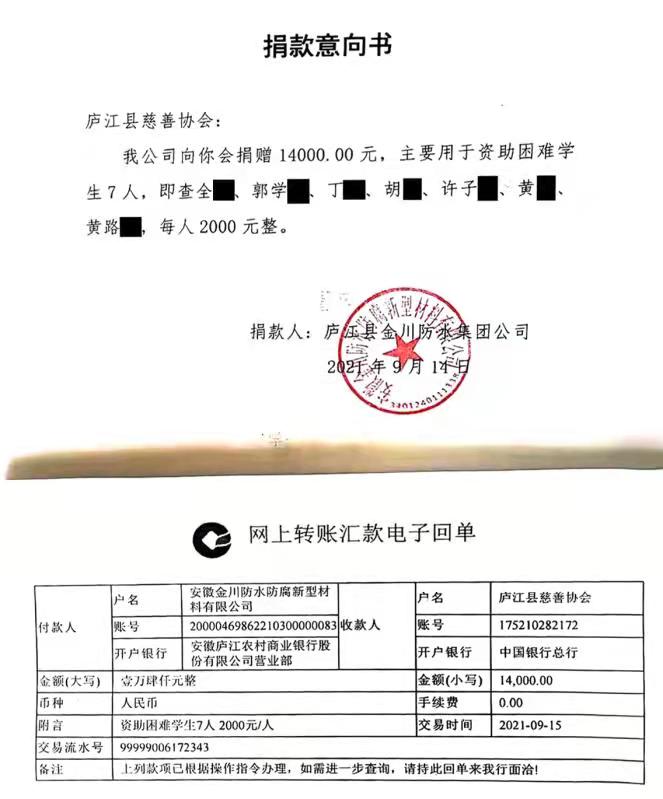 金川防水(集团)一年一度的爱心捐款于2021年9月16日正式拉开帷幕,本次爱心捐款联合庐江县慈善协会和关工委对七名在校学生提供爱心资助基金,每年壹万肆仟元整,直至大学毕业。