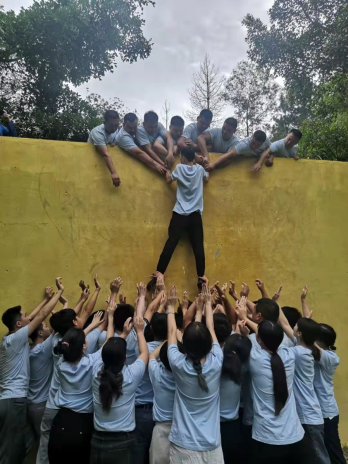 此项目非常考验团队决策和磨练团队意志,在不断调整安排、攀爬,因犯规又重新开始的过程中,不断地在激发大家为了团队的整体利益,勇敢突破自己与无私奉献的精神,非常考验队员间的信任,事实证明团队的力量绝对大于个体的力量,团队的力量及个人的潜能是我们根本无法想象的,当最后一位同事上墙后,教练告诉我们整个过程只用了15分21秒时,我们欢呼呐喊,流下激动的泪水,那种兴奋难以言表。我们超越了预期45分钟的目标,这是我们同心协力的结果,这是我们团队为了目标而奋斗的结果。我们为倒吊着的勇士鼓掌,为最后一个上墙的勇士鼓掌,为给我们伟岸的肩膀,让我们踏肩而上的勇士鼓掌,为伸出苍劲有力的双手,把我们拉上求生墙的勇士鼓掌,为在身后托举双手保护我们的勇士鼓掌。