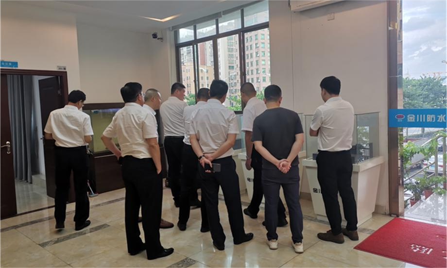 金川防水(集团)董事长许小金先生与总经理许翼先生陪同来访代表参观交流,许董事长对谢董一行的莅临表示热烈欢迎,并向其一行介绍了集团多个版块,包含公司主营产品、产研团队规模、合作模式、公司未来发展、管理思想等多个板块。