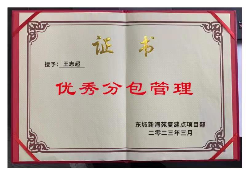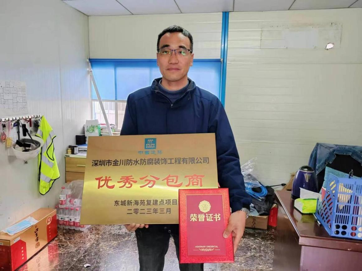 2023年第一季度,由金川防水承建,华东事业部施工的“东城新海苑复建点项目”荣获《优秀分包商》称号。