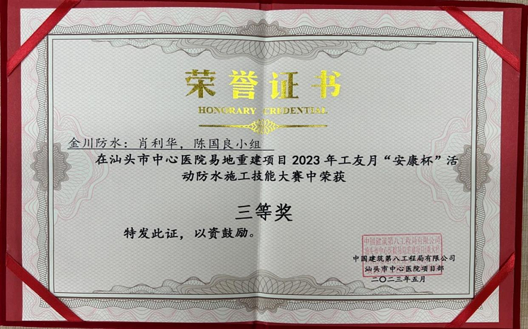 由金川防水承建,华南事业二部施工的“汕头市中心医院易地重建项目”荣获《分包质量考核红榜—专业分包单位》、项目经理荣获《质量工匠之星》称号,劳务班组在该项目工友月“安康杯”活动防水技能大赛中荣获《三等奖》。据悉该项目本月度仅三家单位荣获该奖项。