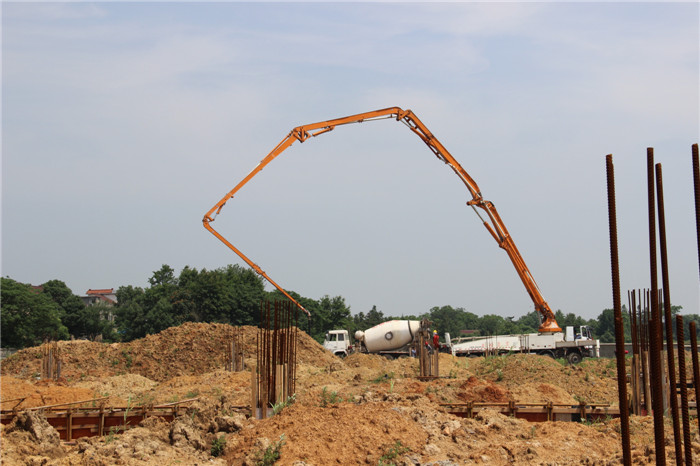 施工现场,工人们正在用混凝土泵车对模板浇筑混凝土,混凝土搅拌车和混凝土泵车排在路边,长长的大手臂从晴空中伸出来,把从卸料处将混凝土输送至用料点。混凝土浇筑质量的好坏,直接关系到建筑物的质量安全,所以,对全过程混凝土施工的技术要求清晰明了,有助于确保工程质量,从而保证建筑的整体水平。