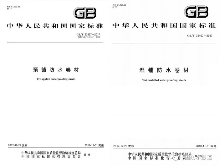 2018年11月1日,GB/T 23457-2017《预铺防水卷材》和GB/T 35467-2017《湿铺防水卷材》两个标准开始实施。