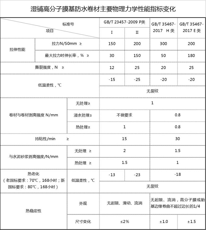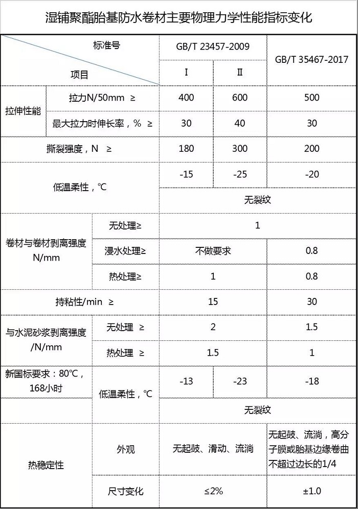 GB/T 35467-2017《湿铺防水卷材》取消了I型II型的说法,这符合国际潮流。下表为新旧国标具体指标对比:(点击查看大图)