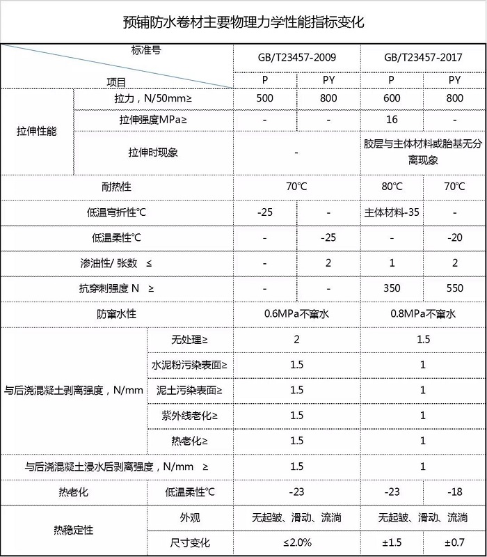 第四,预铺防水卷材物理力学性能指标也发生了些变化,详见下表。(点击查看大图)
